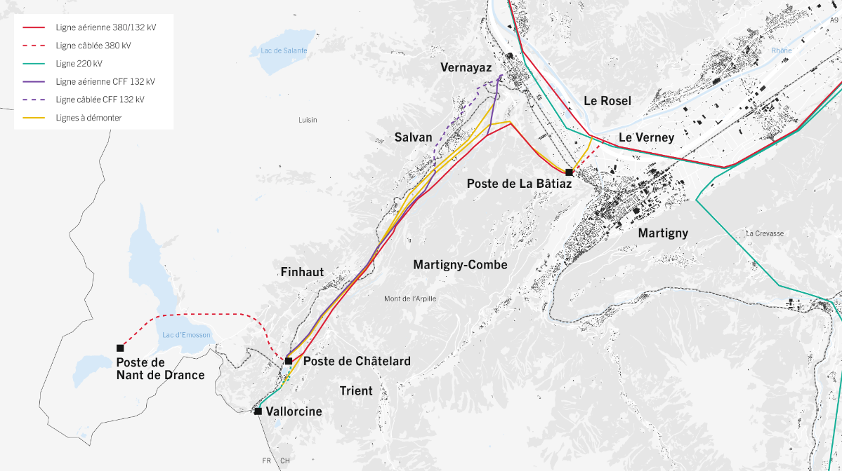 Le raccordement de la centrale de pompage turbinage de Nant de Drance comporte plusieurs axes de construction de lignes aériennes et souterraines 380 kV entre Nant de Drance et la plaine du Rhône à Martigny, 132 kV CFF entre Châtelard et Vernayaz et 220 kV entre Châtelard et Vallorcine. Dès la mise en service de ces nouvelles lignes, la ligne actuelle 132/220 kV entre Châtelard et la plaine du Rhône à Martigny sera démantelée. Sur le territoire de la commune de Salvan, la deuxième ligne 132 kV CFF sera déplacée jusqu'au zoo des Marécottes, puis enterrée jusqu'à Vernayaz.