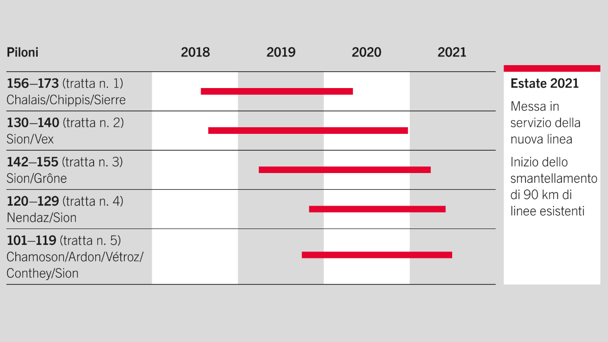 Costruzione di una nuova linea aerea di 30 km fra Chamoson e Chippis che si estenderà lungo i pendii che costeggiano la sponda sinistra del Rodano. Raggrupperà 4 tensioni sullo stesso supporto: 380 kV, 220 kV, 65 kV (fra Chamoson e Aproz) e 132 kV CFF (fra Chamoson e St-Léonard). Ciò comporterà l'eliminazione di quasi 89 chilometri di linea nella Piana del Rodano.